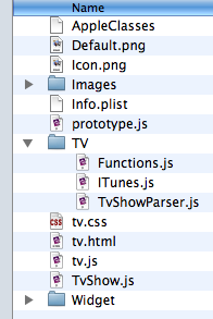 For the curious ones, here’s the diff of all my changes, plus the code for the data proxy script used by the widget. Feel free to use that script on your own server, and edit TV/Functions.js to point to your version of the script. It requires PHP 5 and MySQL, among other things…